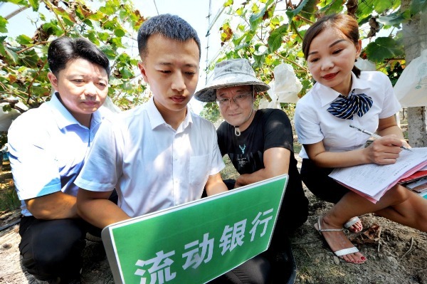 Employees from Bank of Shangrao (second from left, right) help small-sized enterprise owners apply for loans in Shangrao, Jiangxi province, in September. [Photo by Zhuo Zhongwei/China News Service]