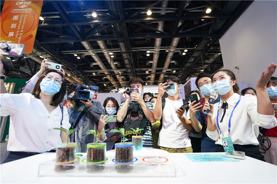 Journalists take photos at the National Convention Center, one of the two venues for the 2021 China International Fair for Trade in Services, in Beijing on Aug 31, 2021. [Photo/Xinhua]