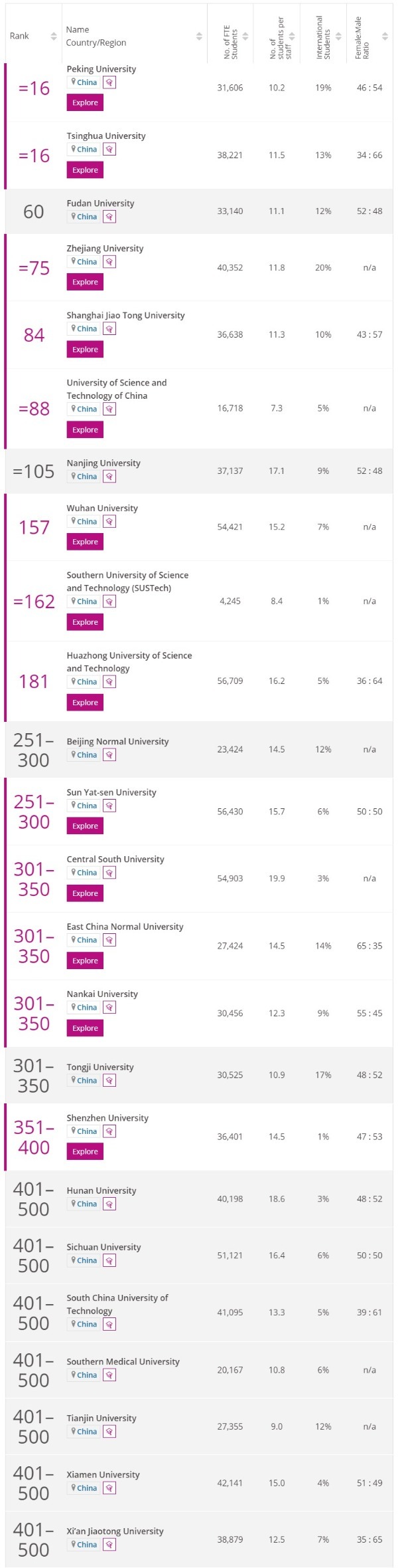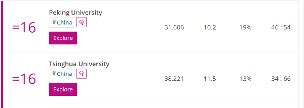 China has two institutions in the top 20 for the first time: Peking University and Tsinghua University share 16th place, after rising seven and four places, respectively. This is also the highest ranking in Asian countries so far.