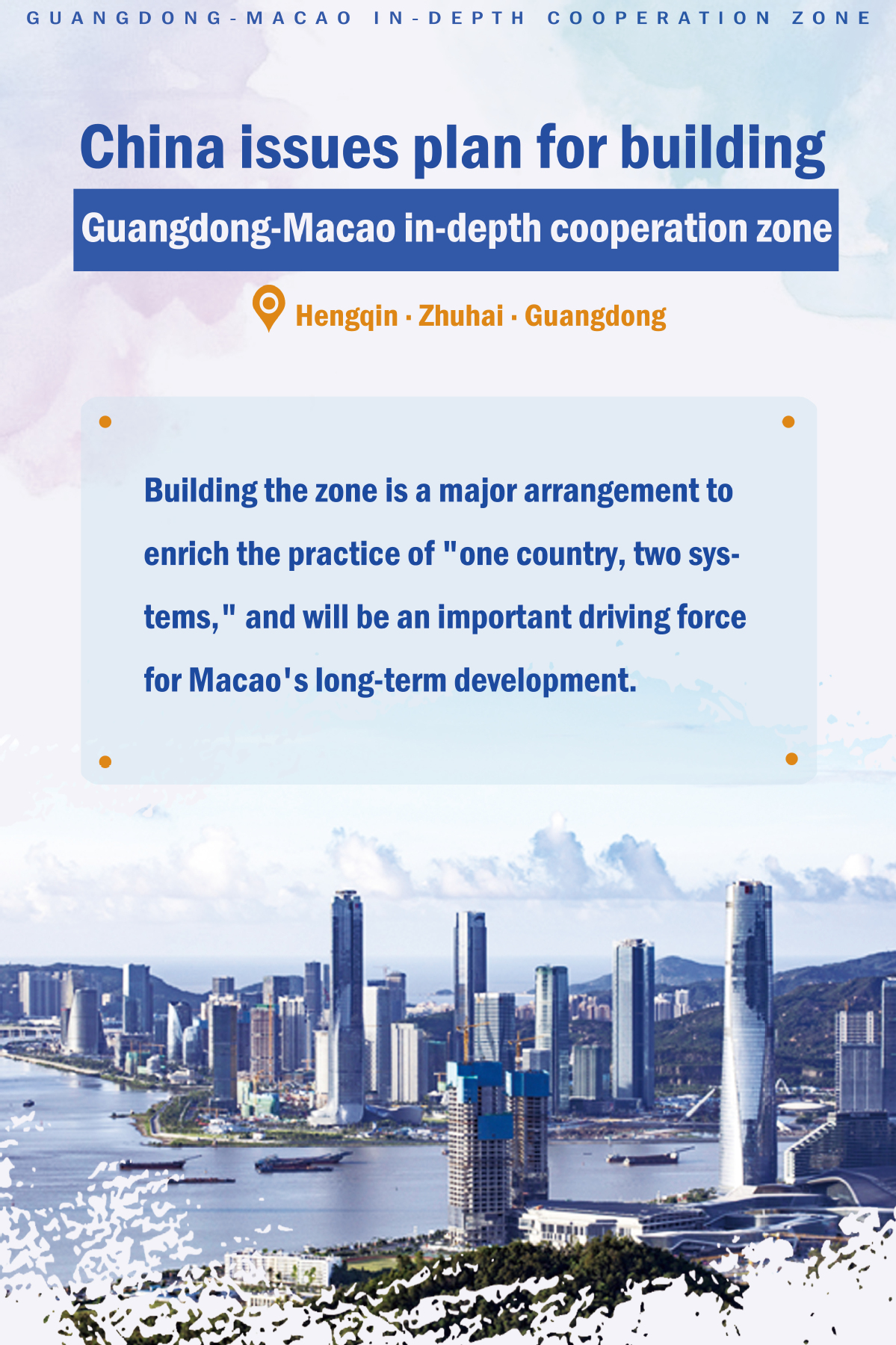 In separate statements, the Macao government and the central government's liaison office in Macao welcomed the plan, saying it will inject new momentum into the SAR's long-term development.