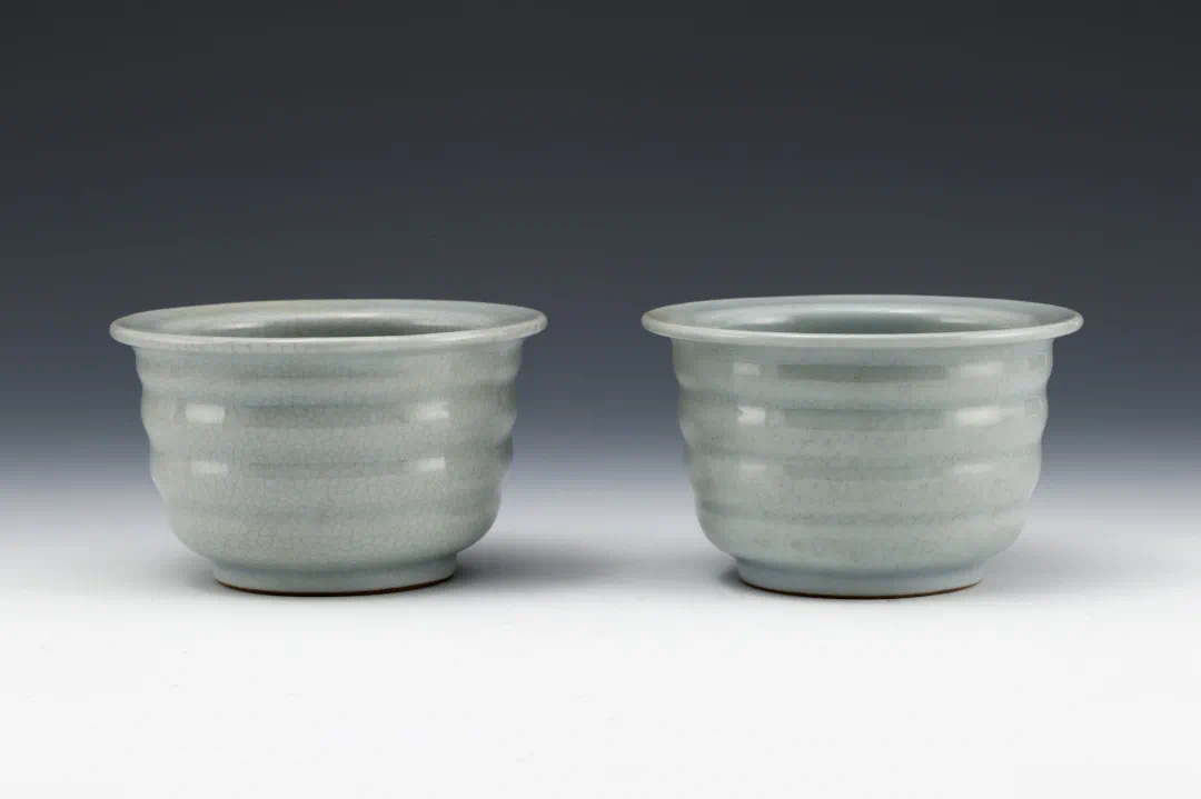 A pair of celadon flower pots dating back to the Yongzheng reign (1723-1735) of the Qing Dynasty (1644-1911), Jingdezhen wares, donated by Hu Huichun (1910-1993) and Wang Huayun couple to the Shanghai Museum in 1950. [Photos/WeChat account of the Shanghai Museum]