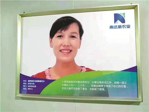 A photograph of 34-year-old Maryam Mamatali is positioned on a wall at a factory run by Nanda New Agriculture Group in Kashgar, a city in the Xinjiang Uygur autonomous region.