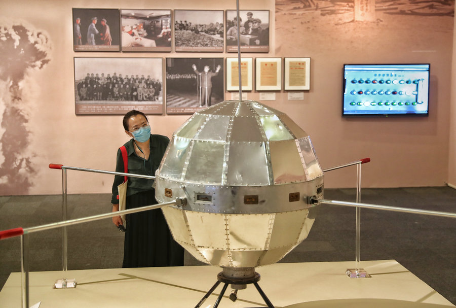 The exhibition, a collaboration with the State Administration of Science, Technology and Industry for National Defence, shows 110 artifacts, models and artworks, as well as more than 500 photos. It traces the industrious course to develop and denote "Two Bombs, One Satellite" -- an atomic bomb (and later a hydrogen bomb), an intercontinental ballistic missile (ICBM) and an artificial satellite.