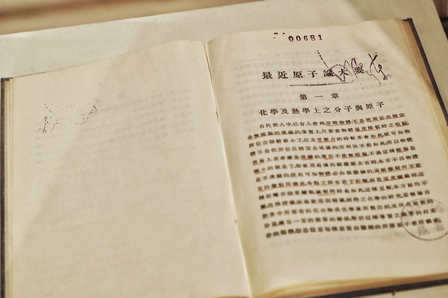 Recent Developments in Atomic Theory, authored by by German physicist Leo Gratz, bears a signature of Chairman Mao Zedong. [Photo by Jiang Dong/China Daily]