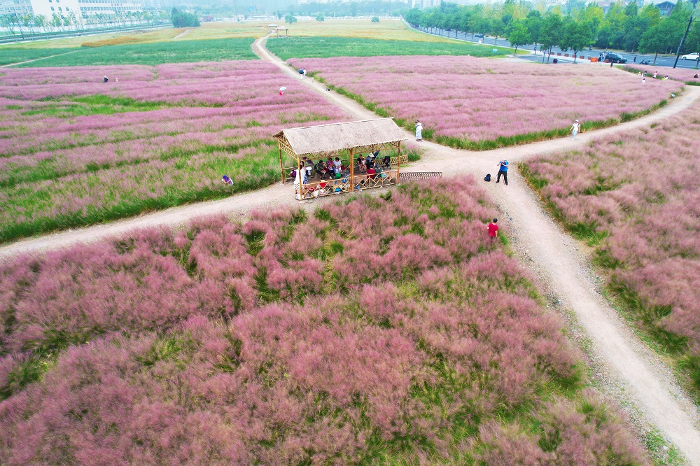 Fancy a fairyland to escape the hustle and bustle for a moment or two? Behold the muglygrass of the Linping district of Hangzhou, Zhejiang province! Growing to a height of nearly half a meter, the grass has turned this field into a ”pink ocean” and attracted numerous visitors to enjoy its beauty.
