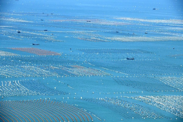 Vast blue seas in Lianjiang county, East China's Fujian province are dotted with countless white oyster beds. [Photo/IC]