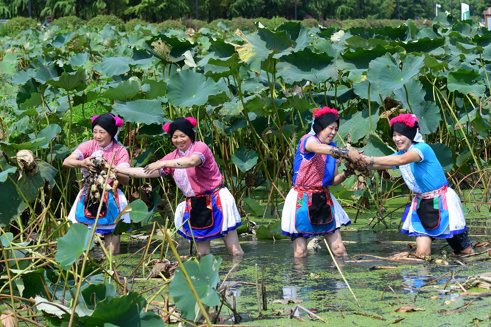Covering an area of more than 230 hectares, a pond full of these “eight treasures” recently saw a fruitful harvest at the Luzhi Shuibaxian Ecopark in Suzhou, Jiangsu province. Women in colorful traditional clothing are busy harvesting them.