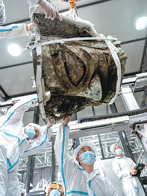 A unique bronze artifact from the No 3 pit features a man carrying a bronze vessel known as a zun that has a round rim and a square body, said Ran Honglin, an archaeologist at the institute.