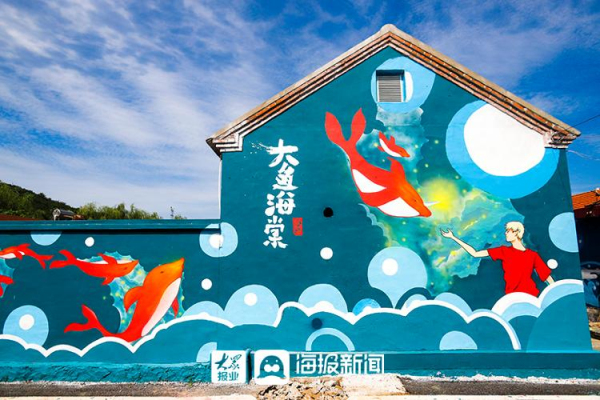 A painting themed on Big Fish & Begonia is seen on the wall of Zhuliu village in Yantai, Shandong province. [Photo/dzwww.com]