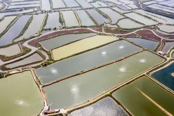 Below the reflection of light and shadow, the shrimp and crab breeding base at Wangtai Neighborhood in Qingdao's West Coast New Area, East China's Shandong province, looks like a multicolored palette on Aug 17, 2021. [Photo/IC]