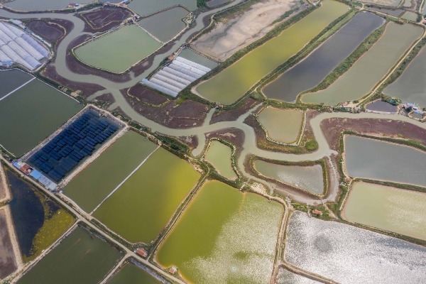Below the reflection of light and shadow, the shrimp and crab breeding base at Wangtai Neighborhood in Qingdao's West Coast New Area, East China's Shandong province, looks like a multicolored palette on Aug 17, 2021. [Photo/IC]