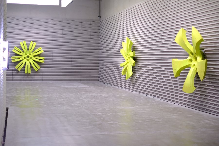For example, to make Anthroposophic Architecture, the artist first 3D-scanned three different SUV rims, scaled them up, and then 3D-printed them with wood before painting them with a type of environmentally friendly yellowish-green varnish, spotlighting the ornamental quality of these car rims.