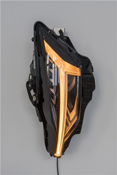 In Heart, the newest iteration of the artist's works on car headlights, a car headlight is adhered vertically to the wall, evoking the shape of a human heart. In the artist's past work, Hater's Headlight, a pair of car headlights are closely placed with each other horizontally on the wall, reminiscent of a hostile glare.