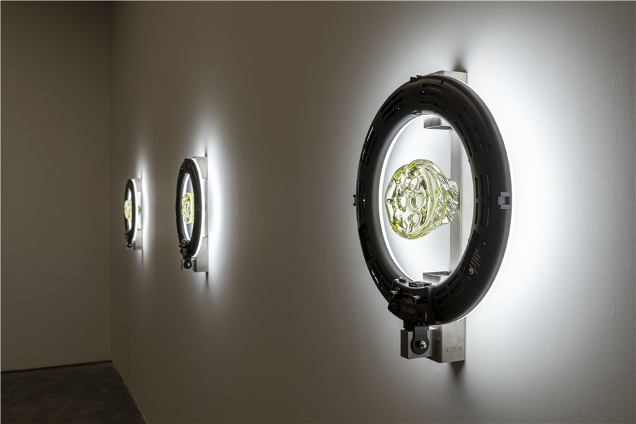 In Trypophobia, a piece of hand-blown uranium glasswork, placed in the center of a luminescent ring light, assumes the shape and color of the lotus seed pods. The artwork, containing poisonous uranium, highlights the vice of excessive self-exposure in the age of social media mania.