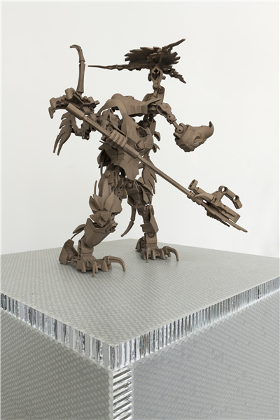 Walking on the galleries' printed carpet, which shows the 3D-scanned UV texture of a cow's carcass, viewers can't help thinking about the gory mess after a bloody battle of those heavily armed Chima warriors.