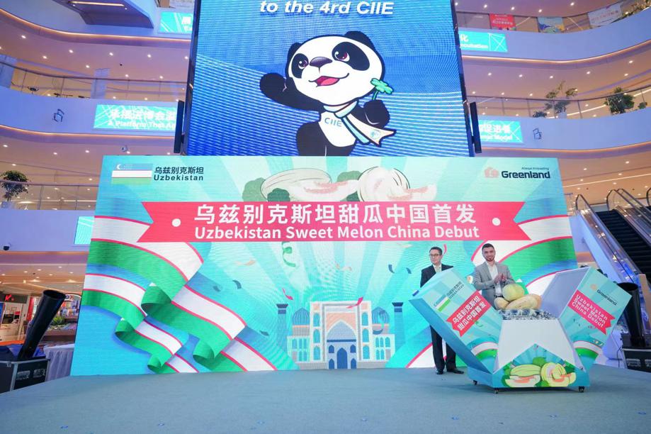 Salico Trading, a Uzbek trade company, showcases Uzbekistan sweet melons, including the famous large Mirza melon which weighs up to 15 kilograms, at the service platform. [Photo provided to chinadaily.com.cn]