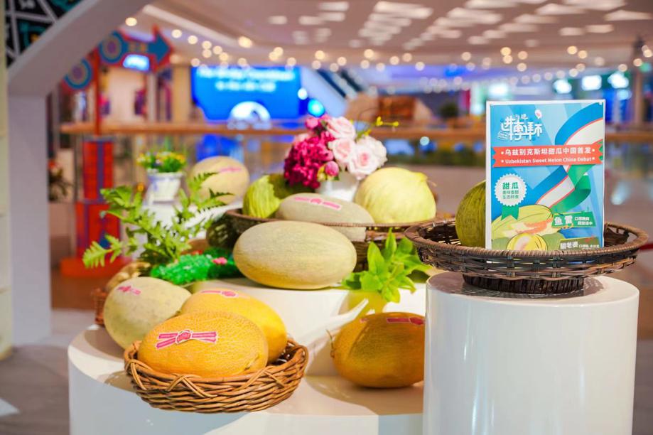Salico Trading, a Uzbek trade company, showcases Uzbekistan sweet melons, including the famous large Mirza melon which weighs up to 15 kilograms, at the service platform. [Photo provided to chinadaily.com.cn]