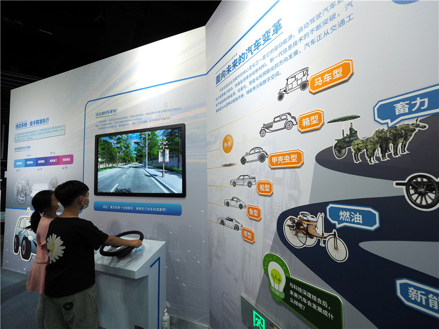 Young visitors interact with a driving simulation at the Beijing Science Center on Sept 12, 2021. [Photo/IC]