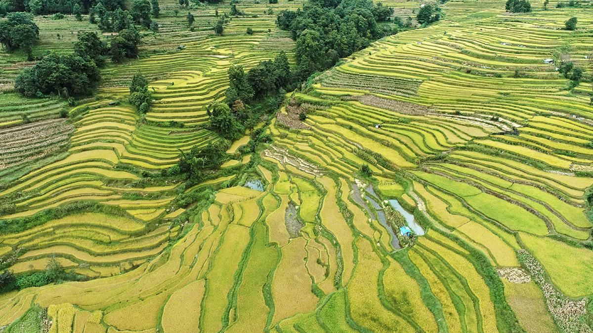 Since the start of autumn, terraced rice fields in Yunnan province have started ripening, presenting a golden harvest view.