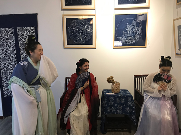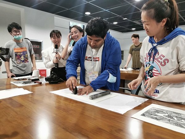 Following their arrival in Qidong, a county-level city of Nantong, the foreigners were treated to local musical and tea art performances, experienced the local art technique of Qidong printmaking, and were presented with a blue calico scarf as a souvenir.