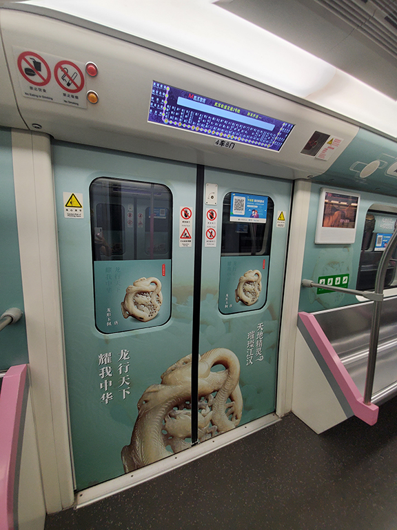 You might be lucky enough to board a subway train decorated with images of museum artifacts in Wuhan from now on! The Wuhan Metro Group, in cooperation with the Wuhan Museum, launched a museum-themed train on the city's subway Line 2 yesterday.