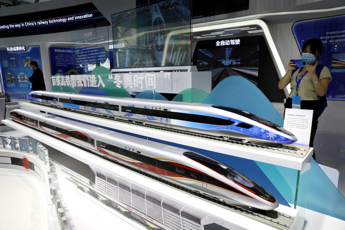 A visitor takes a photo of Beijing-Zhangjiakou high-speed railway models at the Zhongguancun Forum exhibition in Beijing, on Sept 25, 2021. [Photo by Zhu Xingxin/chinadaily.com.cn]