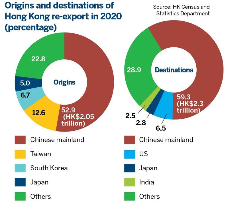 In 2020, the mainland was the largest source and destination country for Hong Kong's re-exports. Hong Kong has become the world's largest offshore trade center. The US and the mainland contribute the bulk of offshore trade income. In 2019, that amounted to HK$298 billion ($38.27 billion), according to the Hong Kong Census and Statistics Department data.