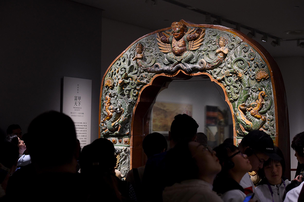 This arched door frame is made up of spare components that were unearthed from an imperial kiln site in Nanjing. The door frame was supposed to be a backup for the splendid glazed pottery pagoda in the Great Proclaiming Grace Temple (Da Bao'en si) in Nanjing. Commissioned by the Ming Dynasty (1368-1644) Chengzu emperor (r. 1403-1424) and lavishly decorated, the pagoda is one of the seven wonders of the Middle Ages. The door frame is now in the collection of the Nanjing Museum.