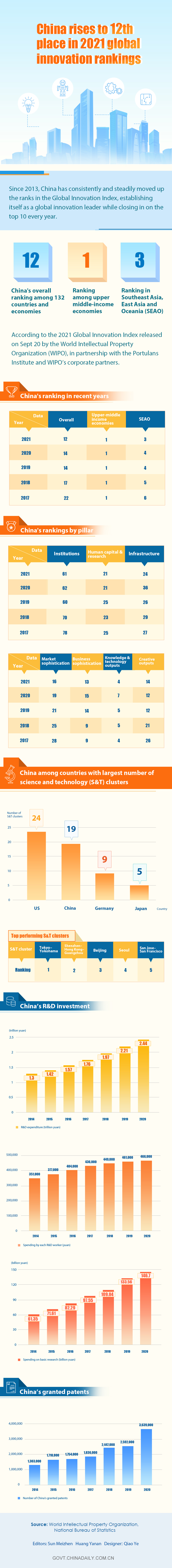 According to the 2021 Global Innovation Index released on Sept 20 by the World Intellectual Property Organization (WIPO), in partnership with the Portulans Institute and WIPO's corporate partners.