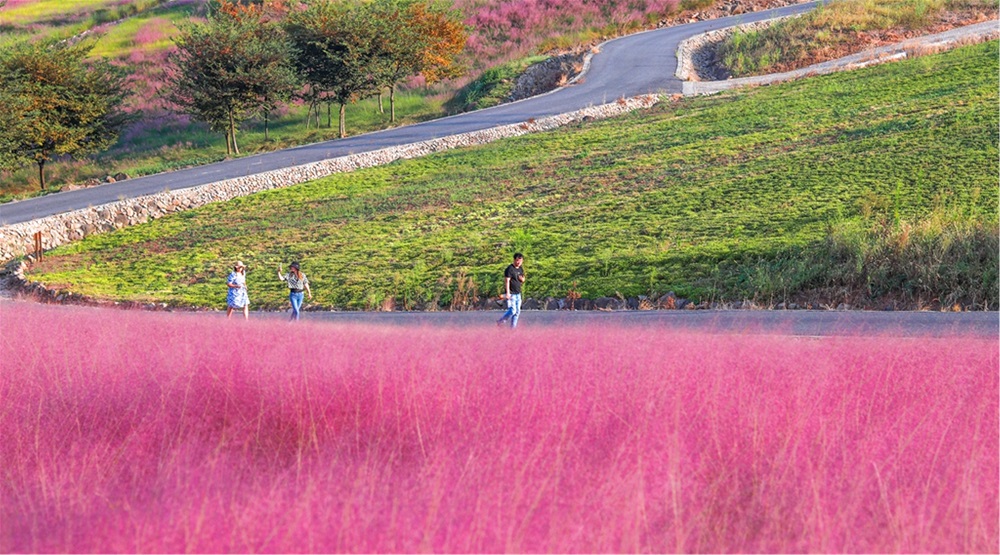 With the national holiday approaching, the Zhiying Town Scenic Spot in Zhenjiang, Jiangsu province, is seeing the flourishing of pink muhly grasses and sunflowers, making for some intriguing scenery.