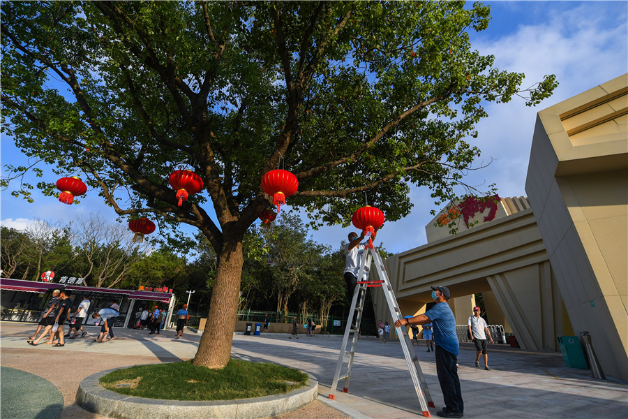 A staff member hangs lanterns to welcome the upcoming National Day holiday in Zhoushan, East China's Zhejiang province, on Sept 26, 2021. [Photo/Xinhua]