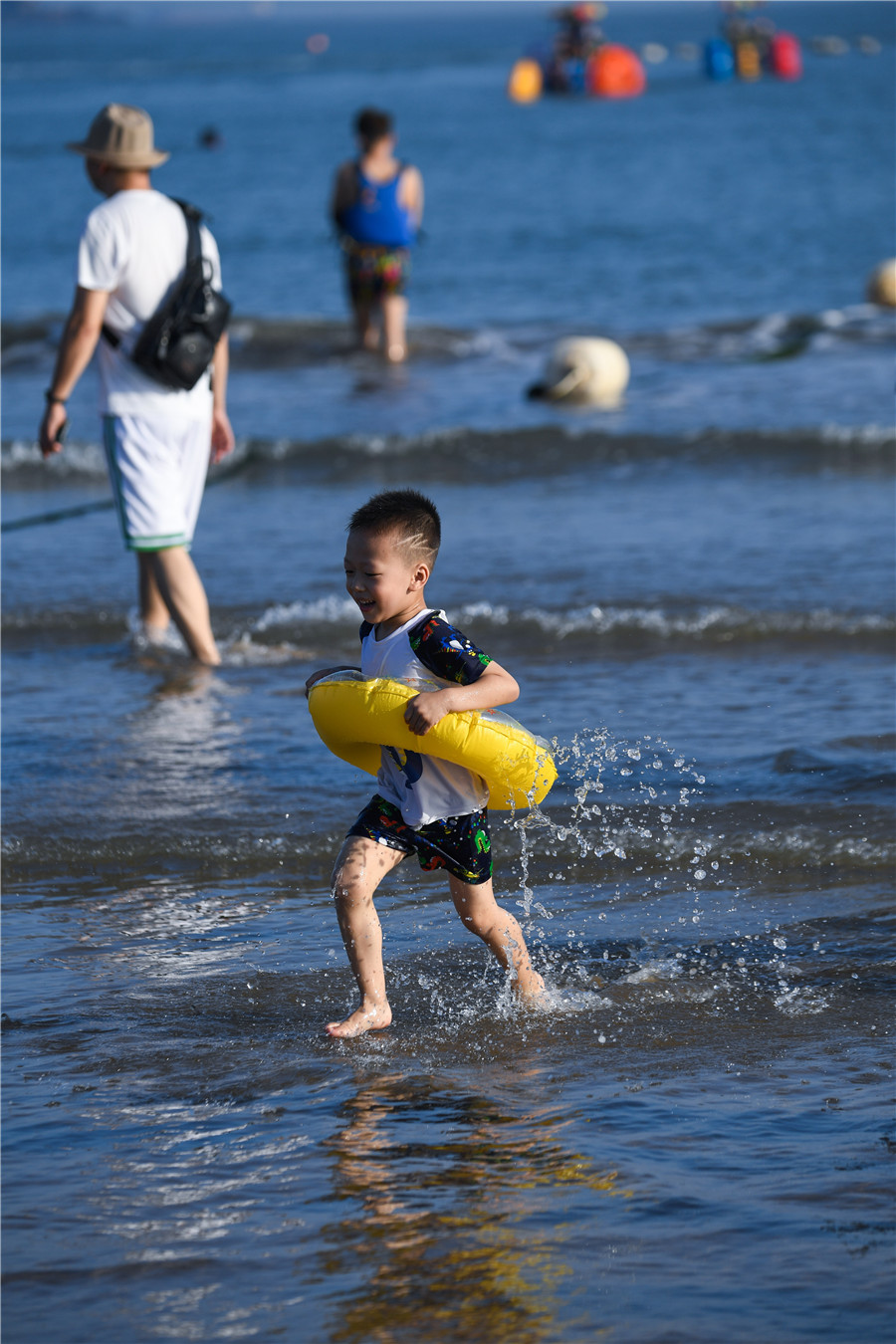 A boy runs in the sea at the Zhujiajian Nansha Scenic Spot in Zhoushan, East China's Zhejiang province, on Sept 26, 2021. [Photo/Xinhua]