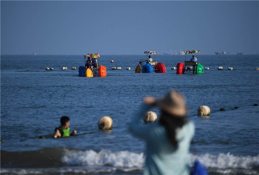 A woman takes a photo of the beach at the Zhujiajian Nansha Scenic Spot in Zhoushan, East China's Zhejiang province, on Sept 26, 2021. [Photo/Xinhua]