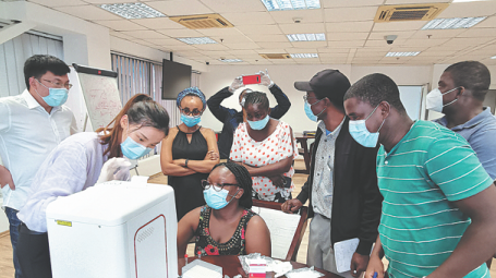 Staff members of Changsha-based Sansure Biotech demonstrate a nucleic acid testing equipment to medical workers from Africa. CHINA DAILY