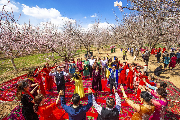 Residents of Aksu in the Xinjiang Uygur autonomous region dance with tourists in a local garden in March. YUAN HUANHUAN/FOR CHINA DAILY