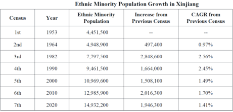 Compared with the data from the sixth national census in 2010, Xinjiang ranked fourth among 31 provinces and equivalent administrative units on China's mainland in terms of the population growth rate. It ranked eighth in terms of the actual increase in population over that period. By 2020, Xinjiang's total population ranking had risen from 25th to 21st in the country.