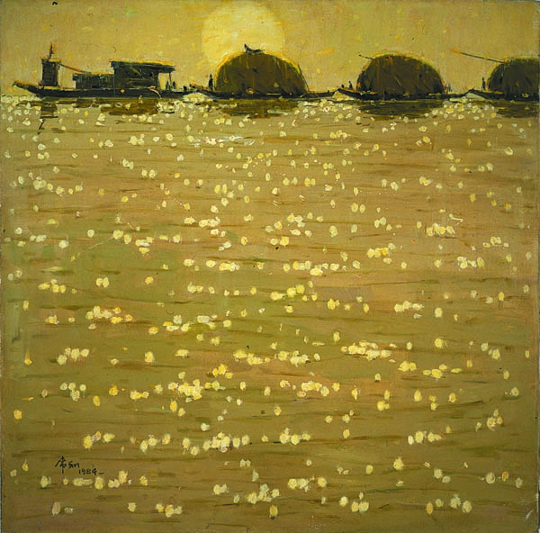 At the exhibition, Ma's 1984 painting, Time of Harvest, exemplifies an effort to make his landscape a wordless poem or an inaudible song. The painting portrays a busy lake in southern China where boats loaded with grains gather and the water shimmers as the sun rises. Ma says the warm tone emphasizes the joy of harvest. The vigorous scene is also featured on the exhibition poster.
