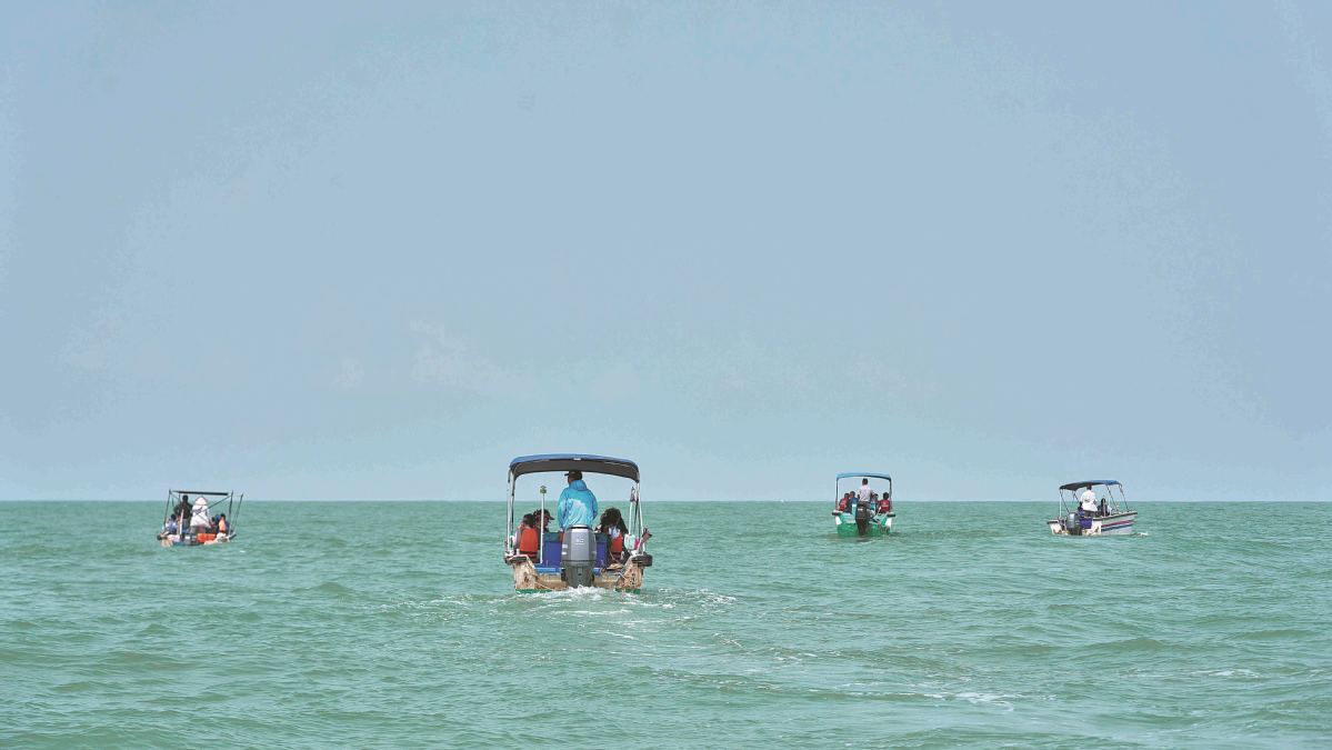The students observed dolphins by following Lin Qiang's boat and the directions in which he pointed. Known in the Sanniang Bay area for his ability to pinpoint the location of dolphins, Lin is an indispensable member of the research team.