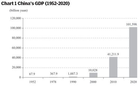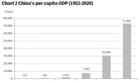 Economic strength has increased significantly. China's GDP soared from RMB67.9 billion in 1952 to RMB101.6 trillion in 2020. As the world's second largest economy, it accounts for over 17 percent of the global total (Chart 1). With per capita GDP rising from less than US$100 in 1952 to over US$10,000 in 2020, China has achieved a historic transformation from a low-income country to an upper-middle-income country (Chart 2). For years it has ranked first in the world in terms of added value in the manufacturing sector and output of over 220 major industrial products. It has also been the world's largest manufacturing country for the past 11 years.