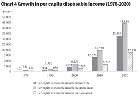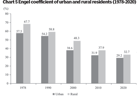 People's lives have been notably improved. Personal incomes have grown steadily, with the average per capita disposable income up from RMB171 in 1978 to RMB32,189 in 2020 (Chart 4). Quality of life has improved, with the Engel coefficient of urban residents down from 57.5 percent in 1978 to 29.2 percent in 2020, and that of rural residents down from 67.7 percent to 32.7 percent (Chart 5). Once their basic need for food and other daily necessities has been satisfied, people want a better life, including better food, clothes, housing, and travel facilities. Subsistence-based consumption is gradually giving way to a model directed towards greater fulfillment and comfort. People regard clothes not only as something that can protect them from the elements, but also as something that can make them look more attractive. Food serves not only to fill an empty stomach, but also to provide better nutrition and good health. People also aspire to live in bigger homes and better neighborhoods, and have faster and more comfortable transport. They are fully supplied with daily necessities and own a range of home appliances; car ownership is increasing rapidly. Consumption of services such as catering, health care, education, tourism, culture and entertainment has continued to surge, and now represents approximately half of China's per capita consumer spending. More people have sufficient time and money to explore their dreams away from the hustle and bustle of daily life. Traveling no longer requires lengthy preparation and has added to the pleasures of life. China has entered the era of mass tourism.