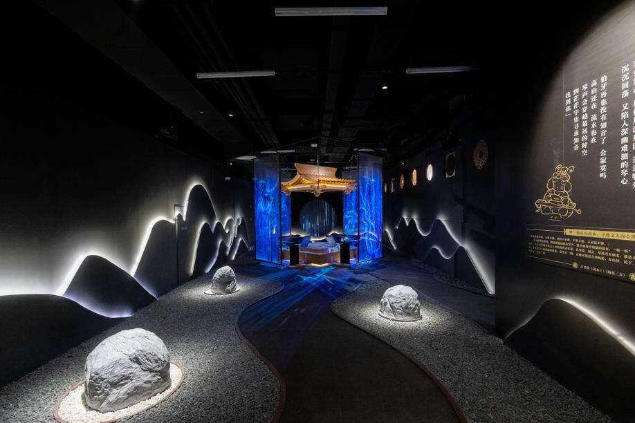 Visitors will first step into the courtyard of a hermit with noble intentions. In a pavilion surrounded by interactive electronic screens, four guqin - a seven-string Chinese zither - are placed in the center. The screen in front of these instruments will show videos of the river, forest and clouds in the mountain whenever visitors touch the string.