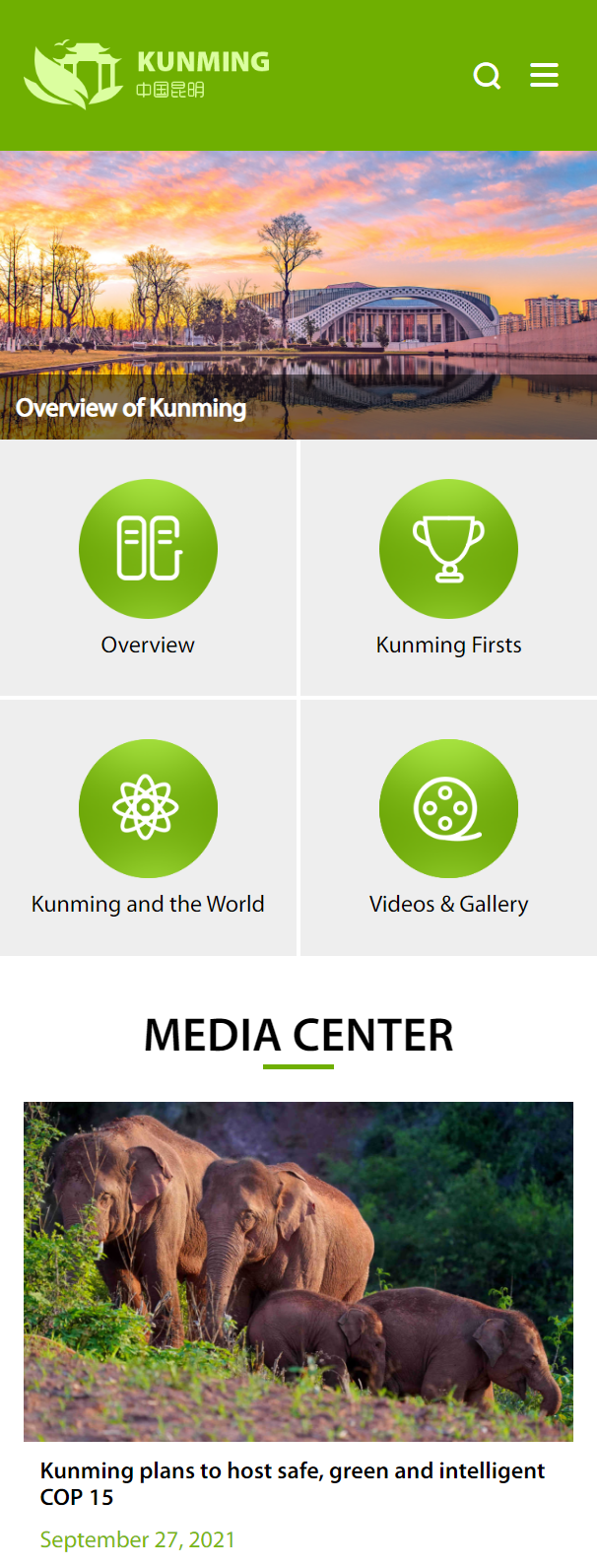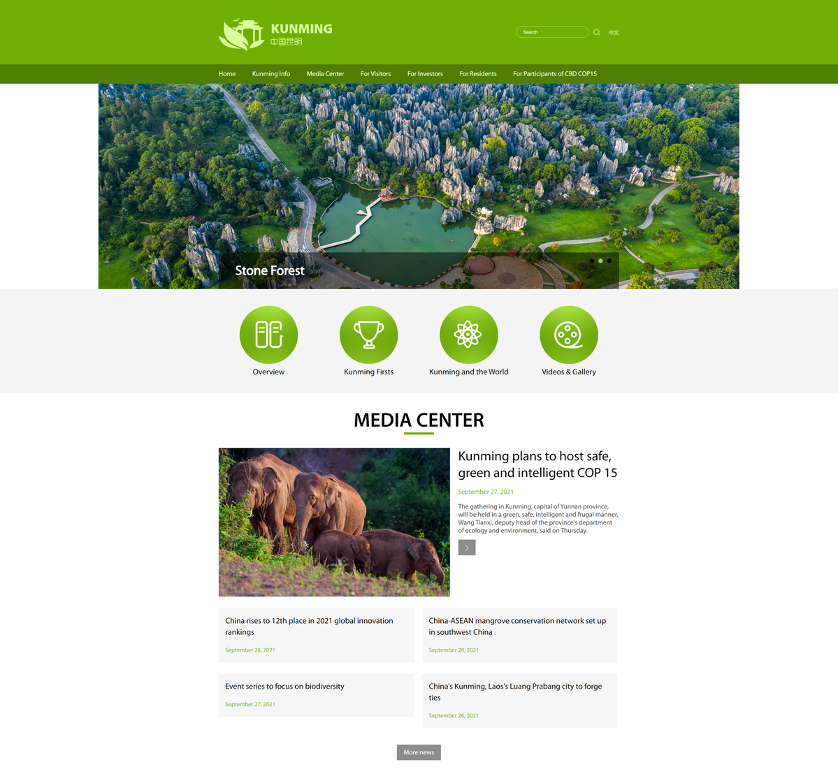 As the primary portal for people in foreign countries to learn about Kunming and an important informational platform for foreigners in Kunming, the English website (en.www.km.gov.cn) aims to function as an intelligent, service-oriented international communication platform, publishing useful information in English and providing life guide and information services for foreign people living in Kunming or participating in the UN Convention on Biological Diversity (COP15) to be held in the city.