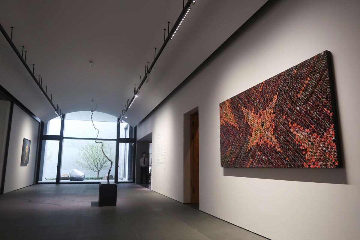 At this exhibition is Early Spring in Jiangnan, a square canvas on which small yellow, green and brown crosses are built up with vertical, horizontal, and diagonal lines, forming an intricate pattern with different layers when observed at different distances.