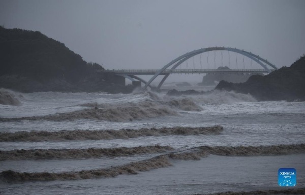 Photo taken on Sept 13, 2021 shows high waves brought by Typhoon Chanthu near Dongsha scenic area of Zhoushan, East China's Zhejiang province. [Photo/Xinhua]