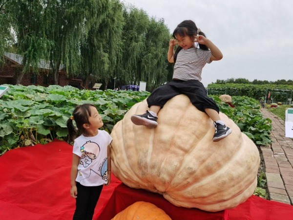 Children take photos with a pumpkin that weighs over 500 kilograms at the 20th China Changchun International Agriculture and Food Expo in Northeast China's Jilin province. [Photo provided to chinadaily.com.cn]
