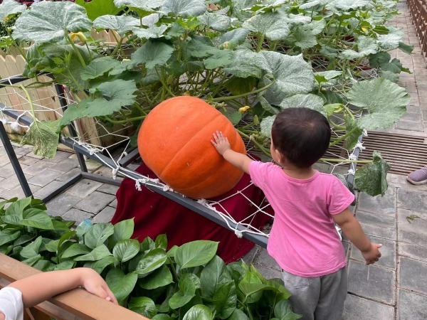 A child is attracted to a pumpkin at the 20th China Changchun International Agriculture and Food Expo in Northeast China's Jilin province. [Photo provided to chinadaily.com.cn]