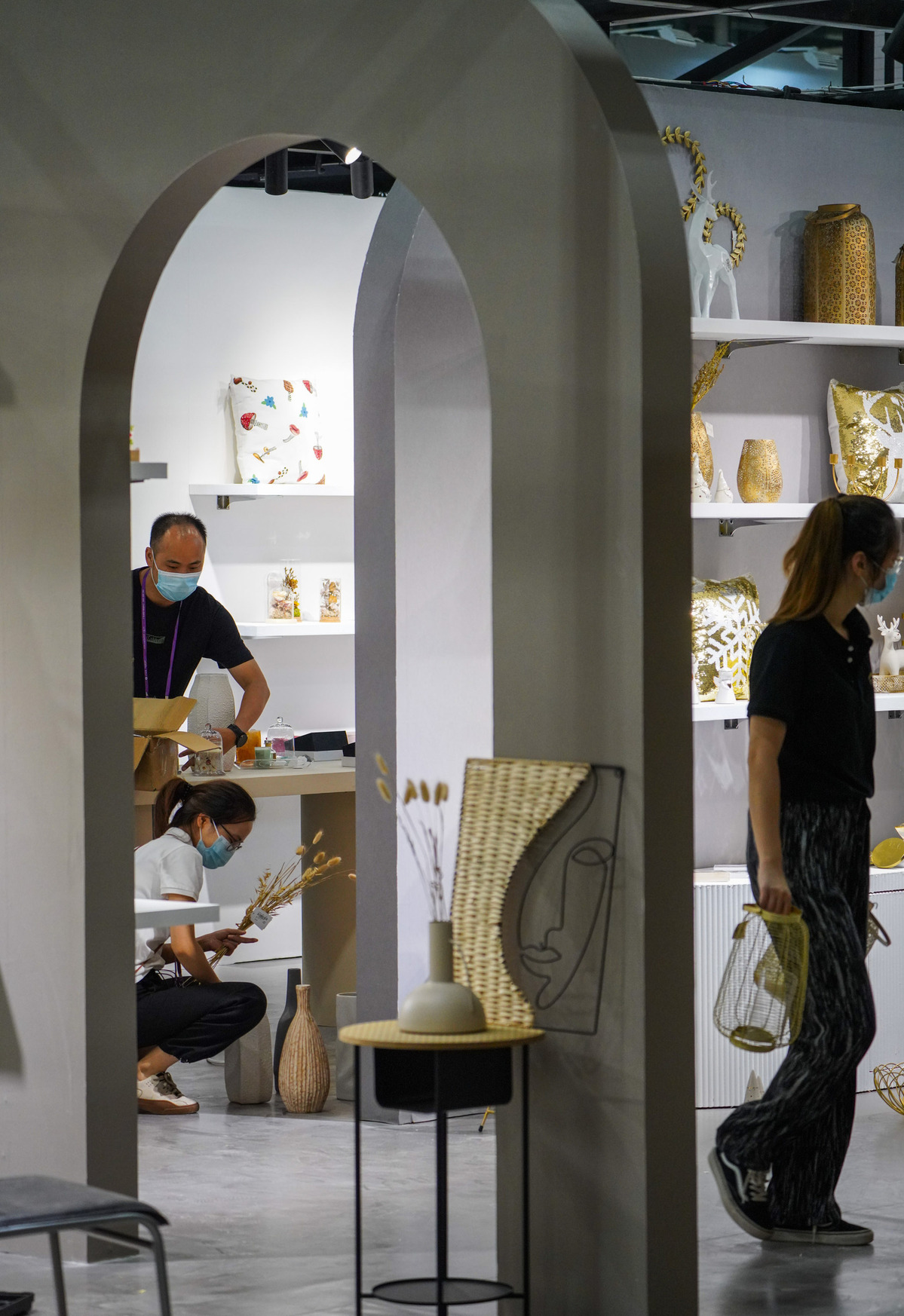 Staff members lay out exhibits at the exhibition center that is going to host the 130th session of the China Import and Export Fair in Guangzhou, South China's Guangdong province. [Photo/Xinhua]