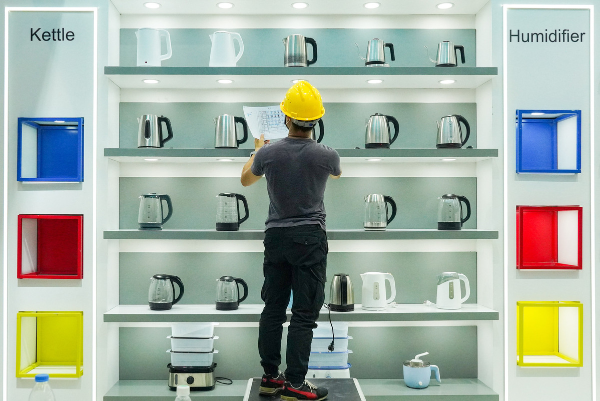 A staff member lays out exhibits at the exhibition center that is going to host the 130th session of the China Import and Export Fair in Guangzhou, South China's Guangdong province. [Photo/Xinhua]