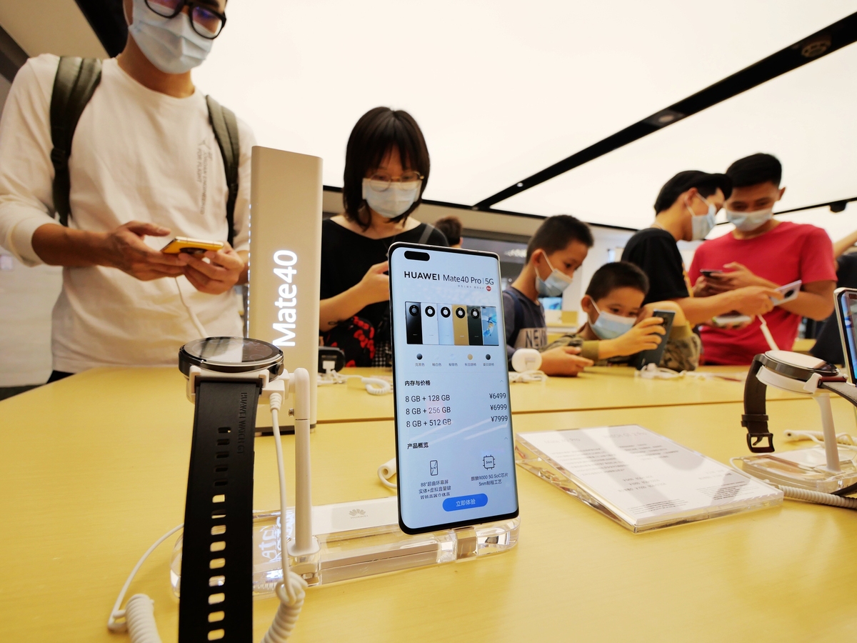 Customers try the Huawei Mate 40 series smartphones at a flagship store in Guangzhou, Guangdong province, on Nov 1, 2020. [Photo/IC]