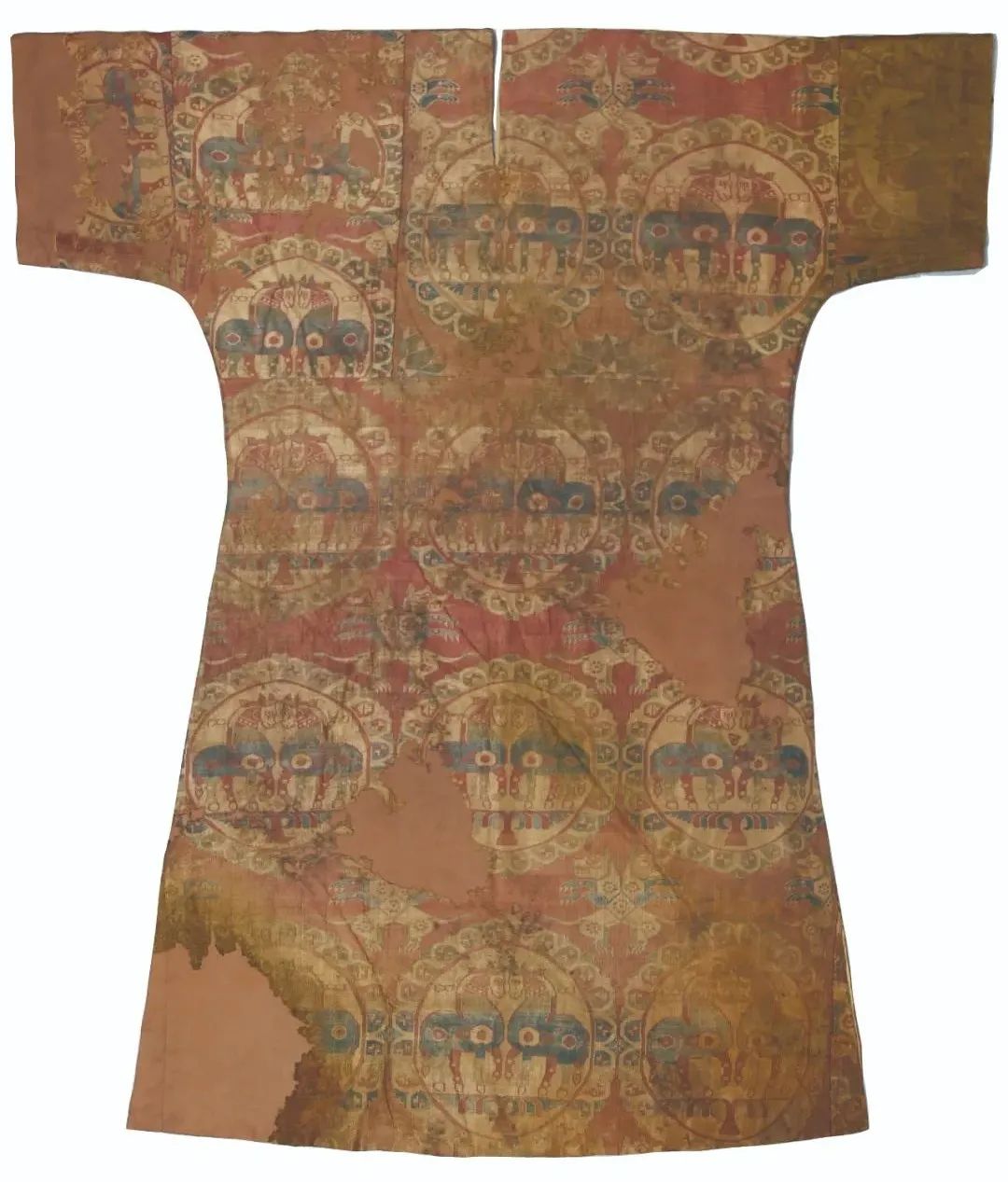 Brocade robe with designs of paired-horse medallions circled with threaded beads from the permanent collection of China National Silk Museum [Photo/Official WeChat account of Gansu Provincial Museum]